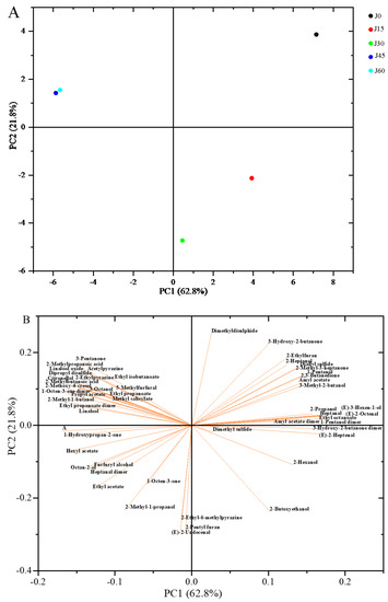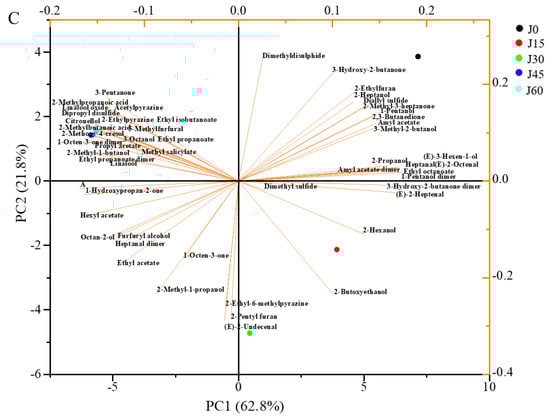 PCA analysis of Jinsixiaozao. (A) Score plot of the first two principal components, J0, J15, J30, J45, and J60 represent refrigeration for 0, 15, 30, 45, and 60 days, respectively. (B) Loading plot of different variances, (C) biplot of PCA.