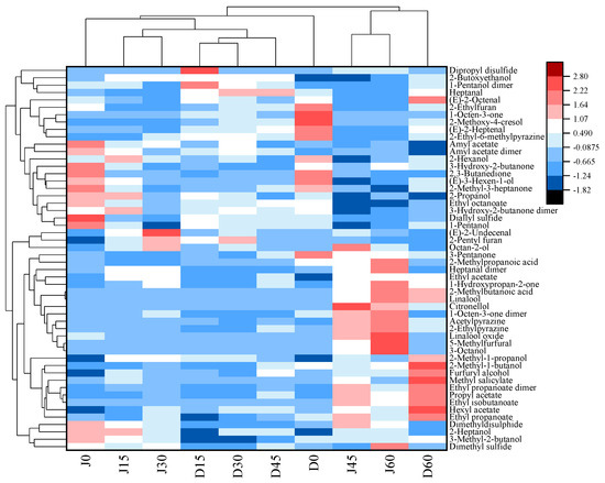To further understand the differences in VOCs of two jujube fruits at different storage periods, cluster analysis was performed using a heat map (Figure 8). According to the vertical direction of the heat map, all samples were classified into two main categories. Jujube fruits from JS that were stored for 45 and 60 days and those from DZ that were stored for 60 days were clustered together to form a group (J45, J60, and D60 in Figure 8), the rest of the samples were clustered together to form another group (J0 to J30, and D0 to D45 in Figure 8). At the late period of storage, the volatile components of DZ were very similar to those in JS and were quite different from those in the early storage period. The second group can also be divided into four categories. Among them, fresh jujube fruits from different cultivars were clustered into two different groups. Jujube fruits from JS, which were stored for 15 and 30 days, were grouped together (J15 and J30 in Figure 8), and those from DZ were stored for 15, 30 and 45 days, which were from the same class (D15, D30, and D45 in Figure 8).