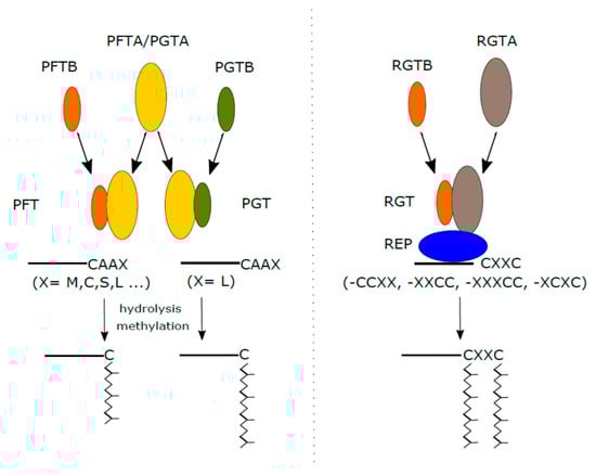 Protein prenylation in plants. The left side of the picture shows the structure of CAAX protein prenyl transferases (PFT and PGT), their preference for a C-terminal motif, processing of the prenylated protein, and a final form of the prenylated substrate. The right side shows the structure of RGT, involvement of the REP protein, possible C-terminal motifs, and a final form of the prenylated RAB GTPase.
