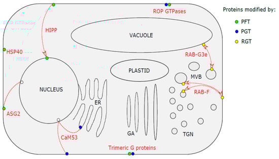 In plants, many proteins are modified by prenylation and these proteins are important factors in many varied developmental processes, as well as in the acclimation of plants to their environment. In this review, we focus on the proteins involved in plant responses to stress (for reference to other types of processes, see the review by Running et al. []). The proteins focused on in this review are summarized in Table 1. For better orientation, Figure 2 provides a graphical overview describing sites of action for the groups of proteins listed, including types of isoprenoid modification.