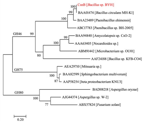 Phylogenetic analysis of CsnB and other chitosanases. The neighbor-joining tree indicates phylogenetic relationships between CsnB and other GH family 46, 75, and 80 members. The scale bar indicates the average number of amino acid substitutions per site. The bootstrap test of the tree was performed with 1000 replications.