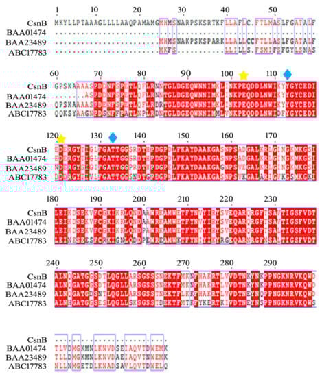 Sequence comparison of CsnB with related chitosanases from GH family 46. Chitosanase MH-Kl (Genbank number: BAA01474); chitosanase from Paenibacillus ehimensis (Genbank number: BAA23489) and chitosanase from Paenibacillus sp. BH-2005 (Genbank number: ABC17783). The identical substrate binding and catalytic sites were marked with blue rhombus and yellow stars, respectively.