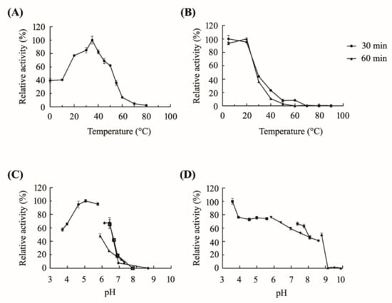 Then, the purified CsnB was used to determine its biochemical properties. CsnB showed its maximum activity at 35 °C (Figure 4A). It was found that it maintained over 70% activity at 20 °C. Meanwhile, CsnB showed 39.5% and 40.4% of its maximum activity at 0 and 10 °C, respectively. (Figure 4A). This result indicated that this enzyme is a cold-adapted enzyme, which exhibited high activity at low temperature. Thus far, only a few cold-adapted chitosanase have been reported. Compared with the other three cold-tolerant or cold-adapted chitosanases previously reported, the residual activity of CsnB is much higher at 0–30 °C [5,20,21]. Cold-adapted CsnM from Pseudoalteromonas sp. SY39 showed 24.1%, 30.6%, and 49.4% of its maximum activity at 0, 10, and 15 °C [20], while CsnB maintained 39.5%, 40.4%, and 76.8% of its maximum activity at 0, 10, and 20 °C, respectively. In addition, the optimal temperature of cold-adapted chitosanase from Janthinobacterium sp. 4239 was 45 °C and maintained its 30%–60% activity at 10–20 °C [5]. Another cold-adapted enzyme, GsCsn46A from Gynuella sunshinyii was reported to maintain 70% of its maximum activity at 15 °C [21]. Overall, CsnB showed its irreplaceable advantages over these chitosanases. Cold-adapted enzymes can perform biocatalytic processes at low temperatures and control the hydrolysis of substrates under mild reaction conditions. Furthermore, low temperature could inhibit bacterial growth and increase the purity of products. Therefore, the application of cold-adapted CsnB in the industrial production has become an interesting research area.