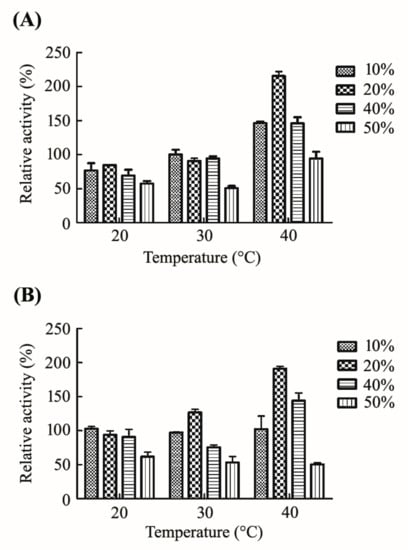 The effect of glycerol on the thermo-stability (20, 30, 40 °C) of CsnB. (A) Residual activity after pretreatment for 30 min. (B) Residual activity after pretreatment for 60 min. The activities of CsnB without glycerol at the same temperature were defined as the control at 100%.