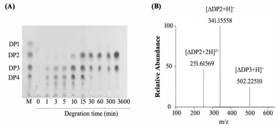 TLC and ESI-MS analysis of enzymatic hydrolytic products. (A) TLC analysis of productions after different reaction times. Lane M: standard chitooligomers (DP = 1–4). (B) ESI-MS analysis. (Disaccharindes: 251.61569 m/z, [∆DP2 + 2H]2+; 341.15558 m/z, [∆DP2 + H]+. Trisaccharides: 502.22510 m/z, [∆DP3 + H]+.).