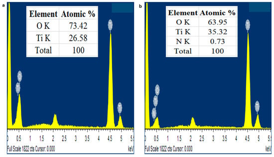 The EDX data in Figure 3 demonstrates that TiO2 nanoparticles were composed of only titanium and oxygen while N-doped TiO2 nanoparticles also had nitrogen found on the surface of TiO2. No other impurity was detected and these nanoparticles were found stoichiometric. Our results are concordant with the previous finding []. The SEM and EDX results were coinciding with XRD results as they also declared phase purity of TiO2 nanoparticles and N-doped TiO2 nanoparticles.