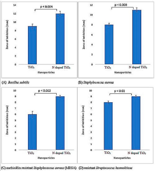 Antibacterial activity exhibited by TiO2 nanoparticles and N-doped TiO2 nanoparticles against Gram-positive bacterial strains; (A) Bacillus subtillis, (B) Staphylococcus aureus, (C) methicillin resistant Staphylococcus aureus (MRSA), (D) resistant Streptococcus haemoliticus. Error bars are shown as standard deviation on each bar. Bars are significantly different at confidence interval level of 95%.