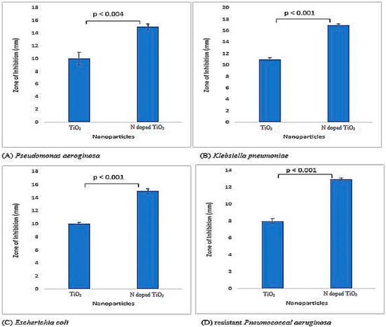 Antibacterial activity exhibited by TiO2 nanoparticles and N-doped TiO2 nanoparticles against Gram-negative bacterial strains; (A) Pseudomonas aeroginosa, (B) Klebsiella pneumoniae, (C) Escherichia coli, (D) resistant Pneumococcal aeruginosa. Error bars are shown as standard deviation on each bar. Bars are significantly different at confidence interval level of 95%.