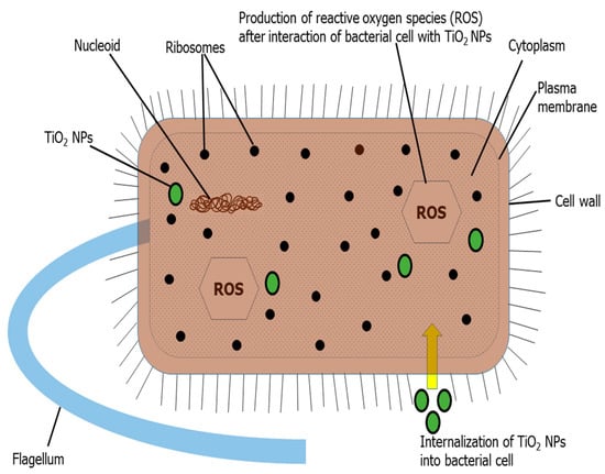 Diagrammatic illustration of mechanism of bactericidal activity of TiO2 nanoparticles.