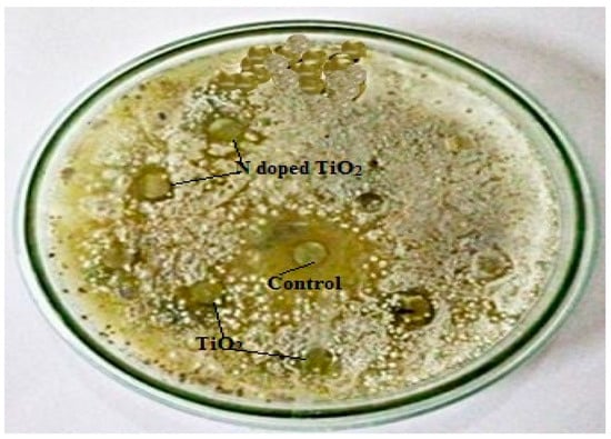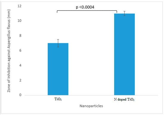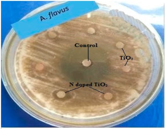 The TiO2 nanoparticles tested for their antifungal potential against Fusarium solani, Aspergillus flavus, Aspergillus fumigatus and Aspergillus niger were found mildly effective against only Aspergillus flavus (zone of inhibition 7 mm and 11 mm for TiO2 nanoparticles and N-doped TiO2 nanoparticles, respectively) as evident from Figure 8 and Figure 9. Our study supports the previous report showing antifungal nature of TiO2 nanoparticles against Candida albicans []. The mechanism of fungicidal activity is not explicitly understood. However, it is thought to involve generation of ROS and oxidative deterioration causing cellular lethality [,].