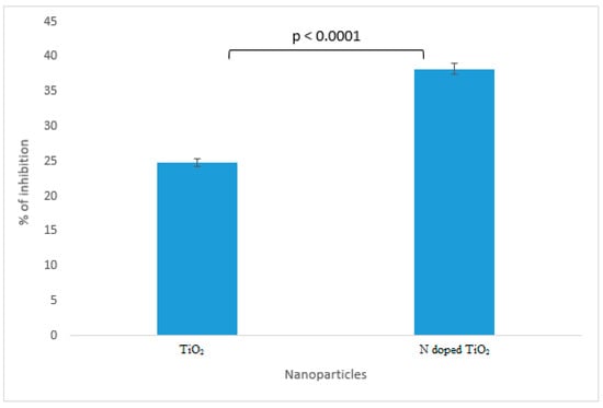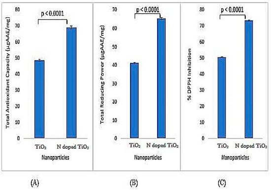 All kinds of antioxidant activities, i.e., total antioxidant capacity (TAC), total reducing power (TRP) and % DPPH inhibition have been observed by both undoped TiO2 nanoparticles and N-doped TiO2 nanoparticles. Prominent antioxidation potential has been documented by the previous studies [,,,]. However, the activities shown by N-doped TiO2 nanoparticles are significantly higher than undoped TiO2 nanoparticles as depicted by Figure 10. A significant elevation in all activities in N-doped TiO2 nanoparticles is believed to be due to the addition of doping agent which reduces size of TiO2 nanoparticles and enhances their reactivity [,].