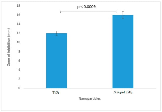 The impact of doping agent was also prominent since the N-doped TiO2 nanoparticles showed more distinct bactericidal effect against all bacterial strains in comparison to undoped TiO2 nanoparticles. The highest antibacterial activity was elucidated by N-doped TiO2 nanoparticles against Klebsiella pneumoniae (zone of inhibition 17 mm) in this investigation. It is believed that doping causes reduction in nanoparticles’ size, their higher surface area, and ultimately more significant antibacterial activity [,]. Moreover, it has been proposed that enhanced antibacterial activity of N-doped TiO2 nanoparticles is due to the synergistic effect of N and TiO2 [,].