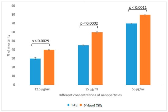 Brine shrimp lethality assay was an appropriate preliminary test for screening of cytotoxicity of undoped TiO2 nanoparticles and N-doped TiO2 nanoparticles. Figure 14 shows that lesser cytotoxicity was obtained by bare TiO2 nanoparticles (70% of mortality at 50 µg/mL) as compared to N-doped TiO2 nanoparticles (80% of mortality at 50 µg/mL). Previous literature supports our findings by suggesting that TiO2 nanoparticles are cytotoxic to various human cell lines and doping further improves the cytotoxic status of these nanoparticles []. He et al. [] elucidated concentration-dependent cytotoxic activity of TiO2 nanoparticles in human prostate cancer cell lines. Chellappa et al. [], Ahamed et al. [], Rahmani Kukia et al. [] and Koca and Duman, [] also reported the in vitro and in vivo cytotoxicity of TiO2 nanoparticles. The mechanism behind cytotoxicity might involve internalization of TiO2 nanoparticles into cytoplasm resulting in generation of ROS by oxidative stress and alteration in cellular redox state. It eventually causes mitochondrial damage and cell death by apoptosis [,,].