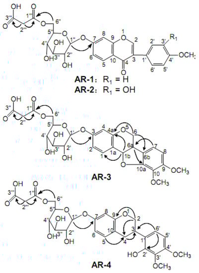 Medium pressure ODS C18 column chromatography (MPLC) has been widely used in isolation and purification of natural compounds, organic synthetic molecules, and biological macromolecules [18]. The MPLC column used was packed with 45–60 μm ODS silica gelto provide a short separation time and high separation efficiency of isoflavonoids [19]. The method was primarily based on the selection of experimental conditions in sample adjustment and elution steps. With simple pretreatment procedures and a short separation time, a phytochemical investigation of Astragali Radix by MPLC led to the isolation of our MIG compounds. The structures and the key HMBC correlation of compounds AR-1 to AR-4 are illustrated in Figure 1. The 13C-NMR and 1H- NMR data of the four compounds are shown in Table 1.
