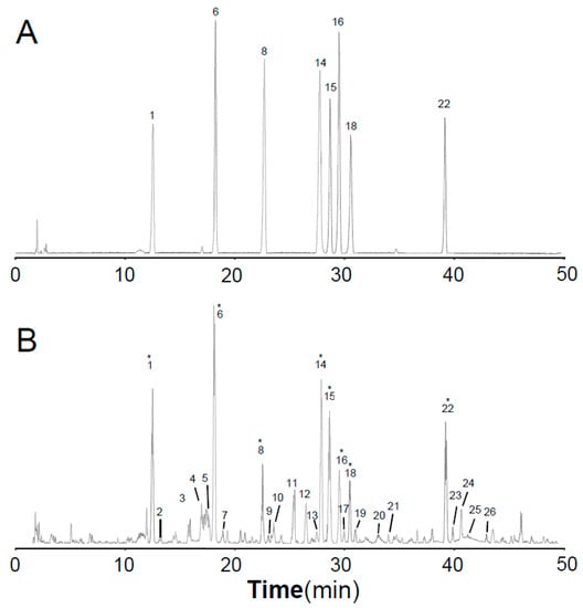 LC-QTOF/MS total ion current (TIC) profile of eight isoflavonoid references (A) and the extract of Astragali Radix (B) operated in positive mode. * These compounds were identified by their corresponding references.