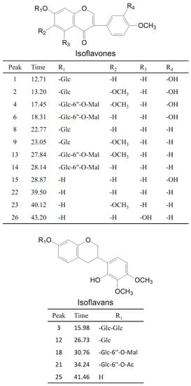 Sample Availability: Samples of the compounds calycosin-7-O-glycoside-6″-O-malonate and formononetin-7-O-glycoside-6″-O-malonate are available from the authors. |