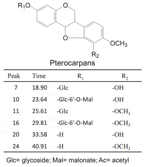 2.2.3. Characterization of Malonyl Pterocarpan Glycosides and Related Aglycones