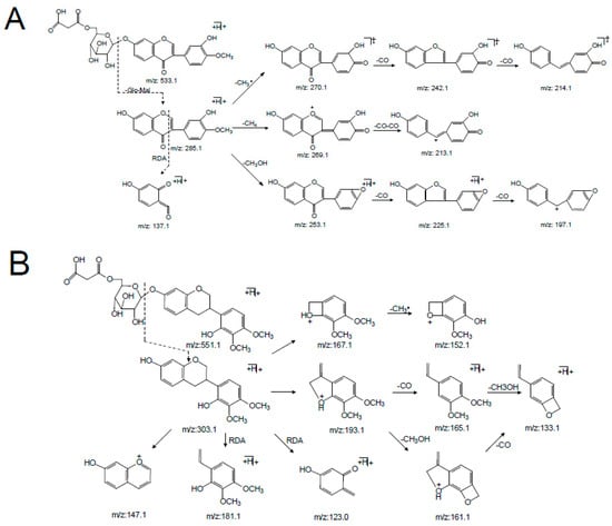 Peaks 6 and 14 were unambiguously identified as calycosin-7-O-glycoside-6″-O-malonate and formononetin-7-O-glycoside-6″-O-malonate, respectively, which were confirmed by comparing their tR values and mass spectra with those of the references. In the positive mode (supplementary materials Figure S1), the [M + H]+ ion of calycosin-7-O-glycoside-6″-O-malonate (6) at m/z 533.1260 (C25H24O13) first lost the 248 Da free radical at the carbohydrate chain, yielding the aglycone ion at m/z 285.0740 [M + H-C6H10O5-C3H2O3]+ (named[Aglycone + H]+) as its predominant fragmentation, which further produced ions at m/z 137.1 corresponding to the RDA cleavage of a C-ring. From the isoflavone aglycone ion at m/z 285.0740 [Aglycone + H]+, the MS2 spectra revealed that the loss of 15 Da (a methyl radical), 16 Da (CH4), or 32 Da (CH3OH) led to the formation of the fragmentation ions at m/z 270.1 [Aglycone + H-CH3]+, m/z 269.1 [Aglycone + H-CH4]+, or m/z 253.1 [Aglycone + H-CH3OH]+, respectively, representing the characteristic fragmentation pathway of 4′-methoxylisoflavones [24]. In addition, the base peak at m/z 285.0740 [Aglycone + H]+ also showed a concurrent loss of CH3· and CO or 2CO, concurrent loss of CH4 and 2CO, and concurrent loss of CH3OH and CO or 2CO, forming the significant ions of [Aglycone + H-CH3-CO]+, [Aglycone + H-CH3-2CO]+, [Aglycone + H-CH4-2CO]+, [Aglycone + H-CH3OH-CO]+, and [Aglycone + H-CH3OH-2CO]+, respectively. These product ions allowed us to propose a fragmentation pathway for the [M + H]+ ion of calycosin-7-O-glycoside-6″-O-malonate (Figure 4A and Table 1).