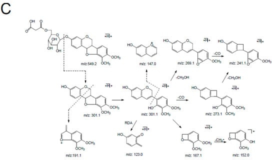 Peak 16 was unambiguously identified as astraperocarpan-3-O-glycoside-6′-O-malonate, which was confirmed by the comparison of its tR and mass spectra with the reference standard. The intense [M + NH4]+ and weak ion [M + H]+ of peak 16 was at m/z 549.1584 and 566.1846, respectively. In the LC-MSn spectrum (supplementary materials Figure S3), successive losses of several H2O and malonyl molecules from the m/z 549.1 [M + H]+ produced m/z 513.1 [M + H-2H2O]+, 495.1 [M + H-3H2O]+, and 409.1 [M + H-3H2O-C3H2O3]+. The distinctive aglycone fragment at m/z 301.1 was formed due to the neutral loss of 248 Da (malonyl glucose moiety) from [M + H]+. The product ions at m/z 273.1, 269.1, and 241.1 arose from the aglycone ion by concurrent loss of CH3OH (32Da) and CO (28Da) fragments; the ion at m/z 123.0 was produced from the RDA cleavage of the aglycone ion. In addition, the other product ions were at m/z 191.1, 167.1, 152.1 and 147.0 due to the losses of the B-ring and C-ring arrangement (Figure 4C). This result indicated that peak 16 (pterocarpans) exhibited similar MS/MS fragmentation features to that of peak 18 (isoflavans). The main difference between peaks 16 and 18 was that pterocarpans yielded the typical ions by the concurrent loss of CH3OH and CO from [Aglycone + H]+ ion, where asisoflavans did not show the same characteristic losses.