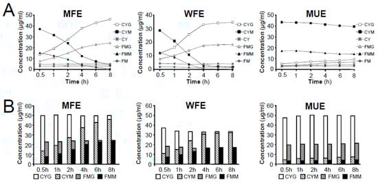 By comparing the contents of individual components, the highest yield of the two MIGs (CYM and FMM) was achieved by MUE among all three extraction methods used; conversely, the contents of related glycosides (CYG and FMG) were lower in MUE than in MFE and WFE. Additionally, the contents of CYM and FMM decreased significantly in MFE and WFE during the 8-h extraction, while CYG and FMG showed a remarkable improvement. Furthermore, the contents of two aglycones (CY and FM) in Astragali Radix were relatively low but stable in the three different extraction methods (Figure 5A). In addition, our data showed that the higher the contents of CYM and FMM were, the lower the contents of CYG and FMG observed, which was consistent with the published articles [13]. It suggested that MIGs in raw materials of Astragali Radix might be converted into related glycosides under the elevated temperature conditions, while the glycosides could not be further decomposed into corresponding aglycones. This hypothesis was further confirmed by literatures [12,13] and conversion experiment of reference compounds of CYM and FMM (See Figure S4 and Figure S5 in supplementary materials). The results showed that CYM and FMM only transformed into related glycosides of CYG and FMG, respectively, under methanol reflux extraction condition. Considering the conversion process, although the contents of individual MIGs or related glycosides had a large fluctuation in the procedures of high temperature extraction, the total contents of MIGs and related glycosides should remain basically unchanged. Indeed, we found that the total contents of matched-constituents CYG-CYM and FMG-FMM displayed no obvious change during the long-duration extraction (Figure 5B). In addition, when comparing the total content of CYG-CYM and FMG-FMM, the extraction efficiency of MFE was found to be equivalent to that of MUE and greater than WFE.
