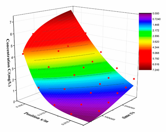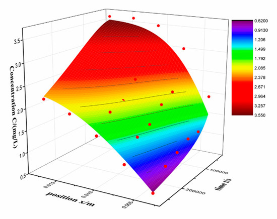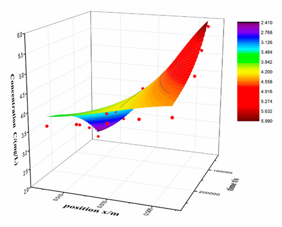 The value of D and R2 is 2.928 × 10−10 m2/s and 0.98, respectively. The result fits well with Fick’s law, indicates that the diffusion is main process of RSV entering to the silica alcogel. The value of diffusion coefficient that Fe2+ enter the silica gels is 3.52 × 10−7 m2/s in our previous work [17], which is far larger than RSV. This is consistent with our expectations, ions are easier to diffuse than organic molecules because of smaller volume. It can be seen in the fitted graph that the measured data (red dot) is above the fitted surface at low concentration and below the fitted surface at high concentration. Actually, it is found that the residual is far larger in low concentration. Table 3 shows the concentrations and residuals at third day and the percentage represents the ratio of the two. The residual is maximal at x = 17.5 mm. In order to minimize the error, the experiment was repeated several times. So, the residual indicates that the inward loading process is not only a diffusion process but an adsorption process. Under the same measurement conditions, the larger the residual, the stronger the diffusion and adsorption coupling. Thus, the inward diffusion coefficient can describe the diffusion process of adsorption coupling. And the residual can represent the coupling strength.