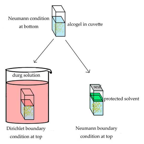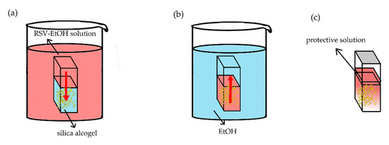 The negative control cuvette was soaked in ethanol. The bottom of the experimental cuvette met the Neumann boundary condition due to the isolation by cuvette (Figure 9). The top of the experimental cuvette met the Dirichlet boundary condition when soaked in the RSV-EtOH solution. If the experimental cuvette was protected by a thin layer and sealed, the top was approximately the Neumann boundary condition. The experimental cuvette was soaked in the RSV-EtOH solution with the volume of 500 mL, far more than the volume of alcogels in cuvettes. Thus, the concentration of RSV in solution could be considered as a constant. Because the RSV is unsteady under light and high temperature, the solution was shaded and put in a constant temperature room (23 °C). This process is named RSV inward diffusion.