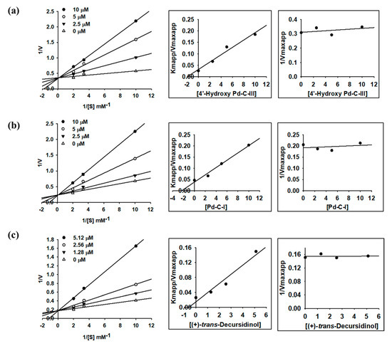 Lineweaver–Burk plots and secondary plots for ACE inhibition of Angelica coumarins (a) 12, (b) 13, and (c) 15.