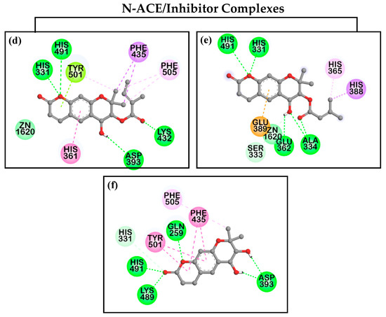 Two-dimensional (2D) diagrams of C-ACE and N-ACE inhibition of Angelica coumarins (a,d) 12, (b,e) 13, and (c,f) 15.