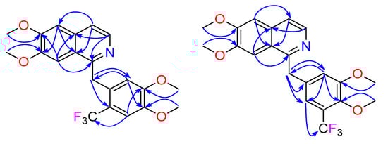 The first products to be fully characterized were compounds 2 and 3. The 1H NMR spectra (Table 1) of these two mono-CF3 derivatives enabled the definitive positioning of the CF3. Careful comparison of the natural product scaffold (1b) NMR data in CD3OD with the fluorinated analogue 2 indicated that this molecule had a CF3 group attached to C-15, since the 1H NMR chemical shifts and multiplicities associated with the pendant benzyl moiety of the starting material had changed from a classic 1,3,4-trisubstituted benzene system (δH 7.03, d, J = 2.1 Hz, H-11, 6.92, d, J = 8.4 Hz, H-14 and 6.82, dd, J = 8.4, 2.1 Hz, H-15) to a 1,3,4,6-tetrasubstituted benzene system (δH 6.41, s, H-11 and 7.26, s, H-14) (Table 1). Furthermore, a heteronuclear multiple bond correlation (HMBC) (Figure 2) from H-14 (δH 7.26) to CF3 (δC 126.4) provided further proof of the structural assignment. In a similar fashion to 2, NMR data analysis of 3 also showed that the CF3 was attached to the pendant aromatic ring of papaverine; however, in this case, the fluorinated moiety was attached to C-14, as indicated once again by the 1H NMR chemical shifts and multiplicities associated with the pendant benzyl moiety of papaverine that had changed from the 1,3,4-trisubstituted benzene system to a 1,3,4,5-tetrasubstituted benzene system (δH 7.22, d, J = 2.2 Hz, H-11 and 7.11, d, J = 2.2 Hz, H-15) (Table 1). The HMBC spectrum analysis of 3 was also critical in confirming the CF3 positioning; key HMBC correlations for 3 are shown in Figure 2.