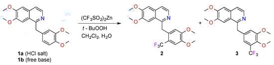 Reaction of papaverine HCl (1a) and free base (1b) with zinc trifluoromethanesulfinate [(CF3SO2)2Zn] and tert-butyl hydroperoxide (TBHP) in CH2Cl2/H2O.