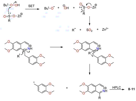 In Scheme 2, we propose that the zinc bis(alkanesulfinate) underwent oxidation by TBHP via a single-electron transfer (SET) process to give a tert-butoxyl radical, hydroxide ion, and the radical cation of the zinc sulfinate, which then underwent fragmentation to give the alkyl radical and sulfur dioxide. The nucleophilic alkyl radical then underwent addition at position 1 of papaverine followed by elimination of the dimethoxybenzyl radical. This addition–elimination mechanism is analogous to that proposed for the reaction of carbon-centered radicals with β-bromostyrene []. The tert-butoxyl radical generated in the first step could oxidize a second molecule of sulfinate to give the tert-butoxide anion and the radical cation of the zinc sulfinate. A similar mechanism has been proposed by Baran et al. [] where the presence of a trace metal initiates tert-butoxyl radical formation, compared to our proposed mechanism that involves SET. The dimethoxybenzyl radical could also be oxidized by TBHP to give the corresponding dimethoxybenzyl alcohol and a tert-butoxyl radical.