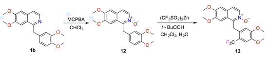 Conversion of papaverine free base (1b) to papaverine N-oxide (12) using meta-chloroperbenzoic acid (MCPBA) in CHCl3 and the subsequent reaction of 12 with zinc trifluoromethanesulfinate [(CF3SO2)2Zn] and tert-butyl hydroperoxide (TBHP) in CH2Cl2/H2O to form compound 13.