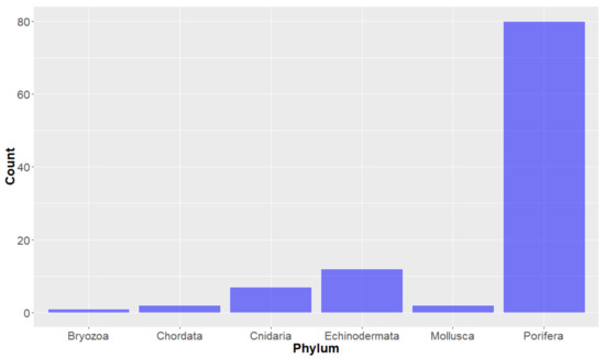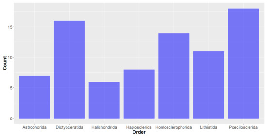 Number of natural products isolated from deep-sea marine organisms of the Porifera Phylum in the Animal Kingdom, by order.