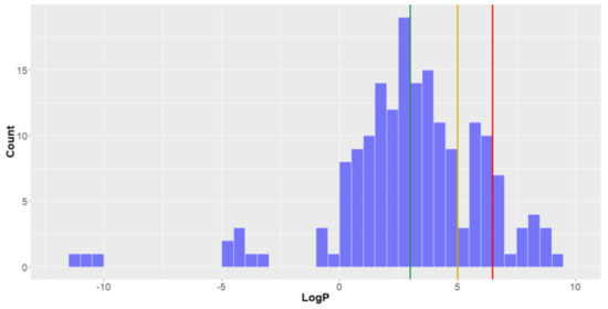 The statistical distribution of the octanol—water partition coefficient (LogP) of all analysed compounds (green = 3, compounds < 3 are in the lead-like space; yellow = 5, compounds < 5 are in the drug-like space; red = 6.5, compounds < 6.5 are in the KDS. Total number of compounds = 179.