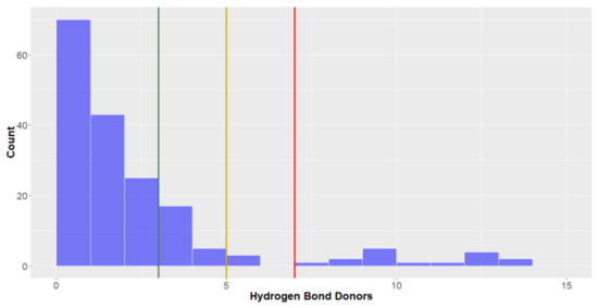 The statistical distribution of the hydrogen bond donors of all analysed compounds (green = 3, compounds < 3 are in the lead-like space; yellow = 5, compounds < 5 are in the drug-like space; red = 7, compounds < 7 are in the KDS. Total number of compounds = 179.