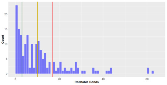 The statistical distribution of the rotatable bonds of all analysed compounds (green = 3, compounds < 3 are in the lead-like space; yellow = 10, compounds < 10 are in the drug-like space; red = 17, compounds < 17 are in the known drug space. Total number of compounds = 179.