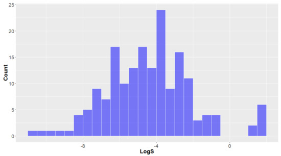 The statistical distribution of the LogS of all analysed compounds. Total number of compounds = 179.