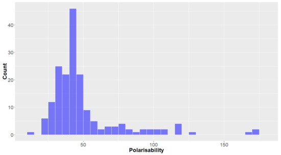 The statistical distribution of the polarisability of all analysed compounds. Total number of compounds = 179.