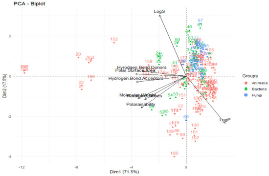 Biplot representing the PCA analysis on the compounds isolated from organisms in the Animalia Kingdom and their molecular descriptors (PC1 vs. PC2). The arrows represent molecular descriptors and the direction in which they hold influence. Each point represents a molecule.