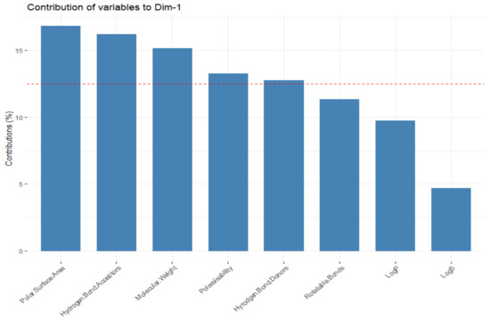 Firstly, looking at the interrelationships between variables (molecular descriptors), it can be seen that principal component one (corresponding to the dimension of the data that explains the greatest amount of variability, on the x-axis of Figure 14) is largely influenced by the polar surface area, number of hydrogen bond donors and acceptors, molecular weight and polarisability. This can be seen by the fact that these variables have a significant horizontal component to their direction (i.e., the direction of the arrows representing the variables are mainly horizontal) in Figure 14, with Figure 15 quantifying this contribution. Along with contributing largely to the first principal component, the polarisability of the compound contributes significantly to principal component 2 (i.e., is orientated mostly in the vertical direction), along with LogP and LogS. The number of rotatable bonds is the largest contributor to principal component 3 (vertical direction in biplot in Figure 16).