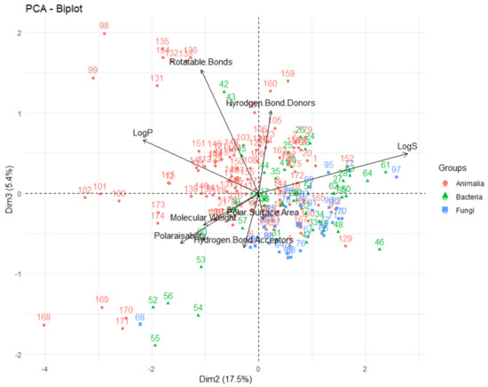Biplot representing the PCA analysis on the compounds isolated from organisms in the Animalia Kingdom and their molecular descriptors (PC2 vs. PC3). The arrows represent molecular descriptors and the direction in which they hold influence. Each point represents a molecule.
