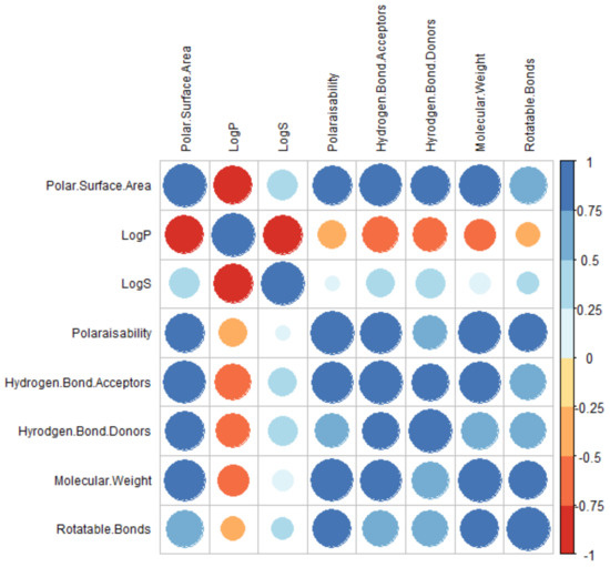 The correlations between variables can also be represented using a correlation matrix, as seen in Figure 17. It can be seen that all variables are, overall, positively correlated with one another, except for the lipophilicity (LogP), which has a negative correlation with all other variables, i.e., as these other variables increase, the LogP decreases, and vice versa. All the other variables have strong intercorrelations (>0.5), except for LogS, which have weaker, but positive, relationships.