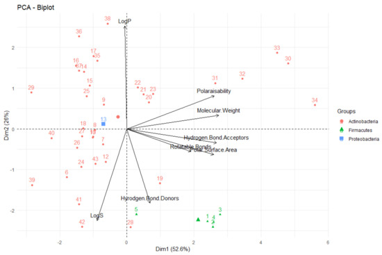 Biplot representing the PCA analysis on the compounds isolated from organisms in the Bacteria Kingdom and their molecular descriptors (PC1 vs. PC2). The arrows represent molecular descriptors and the direction in which they hold influence. Each point represents a molecule.