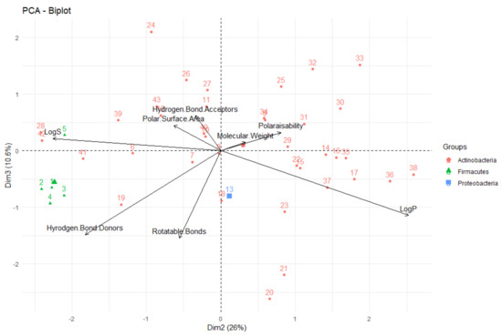 Biplot representing the PCA analysis on the compounds isolated from organisms in the Bacteria Kingdom and their molecular descriptors (PC2 vs. PC3). The arrows represent molecular descriptors and the direction in which they hold influence. Each point represents a molecule.