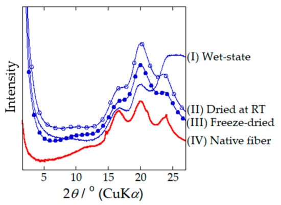 Immersion of freshly extracted S. c. ricini silk glands in 40%-EtOH induced β-sheet formation of SGF in the lumen of the PSG within a few hours (~3 h; visual observation) and peeling the gland epithelium gave a transparent SGF-gel. WAXD 2θ-profiles of the SGF-gel in the wet- (40%-EtOH) and dry-states were as shown in Figure 1. Compared to the β-sheet-rich profile of S. c. ricini native fiber (see profile IV), the SGF-gel already exhibited a β-sheet profile in the wet-state (profile I). However, this profile was somehow distorted, probably due to a high amount of adsorbed EtOH and bulk water in the SGF-gel. By drying the SGF-gel at room temperature or freeze-drying, the EtOH and bulk water were removed or substantially reduced and the profiles of these two dry-states (see profiles II and III) were evidently β-sheet-rich.