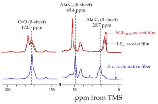 13C solid-state NMR spectra in the ranges 0 to 55 and 150 to 200 ppm of S. c. ricini native fiber (spectrum in blue), and LFaq (spectrum in black) and SGFHFIP (spectrum in red) as-cast films.