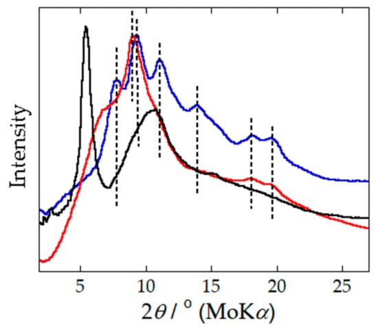 WAXD 2θ-profiles of the LFaq and SGFHFIP as-cast films compared to that of a β-sheet-rich dry SGF-gel are shown in Figure 4. Weak, but distinct and reproducible wide-angle scattering peaks (obtained by Mo-Kα 0.7083 Å radiation) assigned to the β-sheet conformation were observed at 2θ = 18.2° (2.3 Å: corresponding to the β210 reflection) and 2θ = 19.7° (2.1 Å: corresponding to the β103 reflection) in the profile for the SGFHFIP as-cast film, but absent in that of the LFaq as-cast film. This confirmed the FTIR and NMR results regarding the presence of some β-sheet structure in the SGFHFIP as-cast film. On the other hand, a sharp and intense peak at 2θ = 5.5° (corresponding to 7.4 Å) was observed for the LFaq as-cast film but absent in the dry SGF-gel. This peak implied the existence of long-range order, and was clarified to correspond to ordered aggregation of the α-helix structure [].
