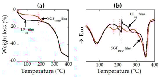 Thermal gravimetry (TG) and differential scanning calorimetry (DSC) profiles of the LFaq and SGFHFIP as-cast films were as shown in Figure 5. In the TG profiles, a significant loss in weight was detected at ~180 °C in the profile of the SGFHFIP as-cast film (indicated by a red dotted line in Figure 5a), but absent in that of the LFaq as-cast film. In an earlier study on B. mori SGF, residual HFIP molecules were confirmed to form an α-helix-HFIP complex [,] that was stable up to ~140 °C, which is higher than the boiling point of HFIP (~58.2 °C) []. This weight loss was considered to be due to the loss of residual HFIP, which was detected by FTIR (see Figure S5) in S. c. ricini SGFHFIP as-cast film, due to a similar phenomenon.