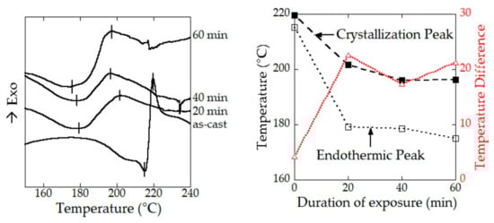 DSC β-sheet crystallization peaks of the S. c. ricini LFaq film treated with HFIP gas at 23 °C for 20, 40, and 60 min. The panel on the right is a plot of the β-sheet crystallization peak temperatures against the duration of exposure to HFIP gas.