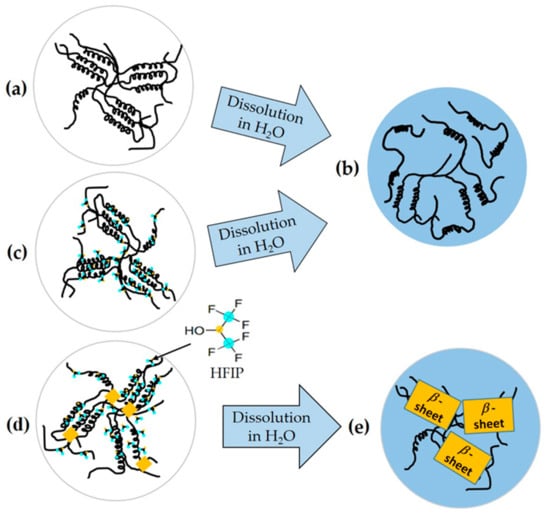 The LFaq as-cast film has an ordered aggregated α-helix structure (a) that easily dissolves in water (b). When treated with HFIP gas, the aggregated α-helices in the LFaq as-cast film and HFIP molecules bind. However, due to low molecular movement in the solid state, the overall aggregation state of the α-helices is retained (c). The bound HFIP is easily removed by water, resulting in dissolution of the film. On the other hand, the 40%-EtOH-treatment induces imperfect β-sheet formation in the SGF-gel. As a result, the SGF-gel PSG is soluble in HFIP. However, some β-sheet structural memory remains, and the SGFHFIP as-cast film cast from a solution of the SGF-gel in HFIP has some β-sheet content which renders it water-resistant (d). Further, removal of residual HFIP in the SGFHFIP as-cast film by water renders it β-sheet-rich (e), indicating an occurrence of water induced β-sheet formation.